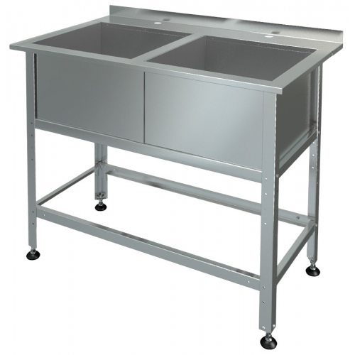 Ножки с регулируемыми опорами — оцинкованная / нерж. сталь, выполнены из уголка 40х40мм. t=1,0 мм с подгибом краёв во внутрь. Каркас оцинкованная/ нерж. сталь t=1,0 мм. Ванна из нерж. сталь AISI 304 t=0,6 мм. (емкости длиной 1,35 и 1,55 из нерж. сталь AISI 430 t=0,8мм). В комплект входит гофросифон. На мойках имеются специальные борты с отверстиями под смеситель.